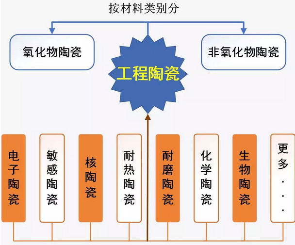 工程陶瓷是指應用于工程技術領域的各種陶瓷的總稱,包括結構陶瓷、功能陶瓷和陶瓷基復合材料。工程陶瓷以其耐高溫、耐磨損、耐腐蝕、化學穩定性好以及獨特的電、熱、光、磁等功能,在新材料領域占有十分重要的地位。工程陶瓷的簡單分類如下圖1所示。