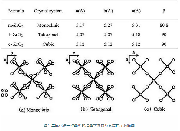 常溫下純二氧化鋯是絕緣體,加入穩(wěn)定劑可使其導(dǎo)電率升高且在高溫下能呈現(xiàn)出離子型導(dǎo)電。二氧化鋯有三種晶型,結(jié)晶學(xué)參數(shù)及其三種晶型的結(jié)構(gòu)示意簡圖如下所示。