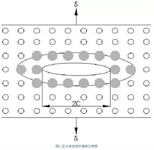 但從另一角度來看,人們利用穩(wěn)定劑及某些特定工藝控制氧化鋯的馬氏體相變,在室溫下可獲得對外界應(yīng)力敏感的亞穩(wěn)態(tài)四方相氧化鋯,制造出可相變的高韌性氧化鋯陶瓷材料,如下圖所示,為應(yīng)力誘發(fā)相變增韌的示意圖。