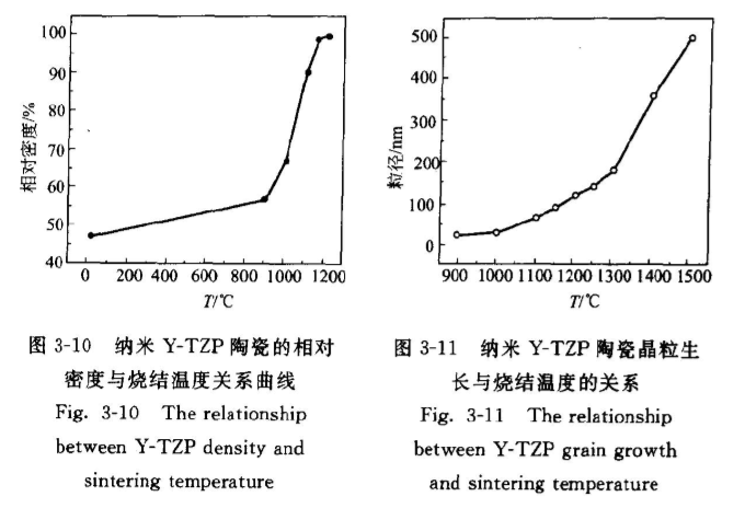 密度與晶粒的變化是燒結過程中最基本的變化。圖3-10是材料相對密度與燒結溫度的關系。從圖3-10可見,和普通陶瓷一樣,納米Y-TZP陶瓷的無壓燒結大致也可分為三個階段:
