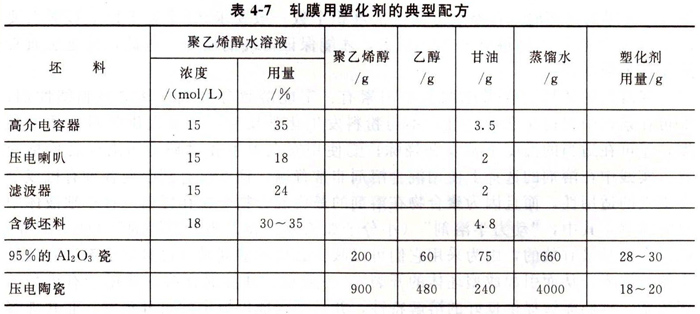 軋膜成型(sheet forming)也屬于可塑法成型。將準備好的坯料拌以一定量的有機塑化劑,使之具有可塑性。塑化劑是由黏合劑、增塑劑、溶劑、消泡劑等配制而成。黏合劑要求有足夠的黏合力、較好的成膜性能(良好的延展性和韌性),并具有燒后灰分少、無毒性的特點。增塑劑所起的作用是插入高分子化合物的鏈段之間,減弱相互之間吸引力,使黏合劑受力變形后不致出現彈性收縮和破裂,從而提高坯料的可塑性。溶劑的主要作用是溶解黏合劑和增塑劑。軋膜成型常用的黏合劑、增塑劑和溶劑列于表4-6中。